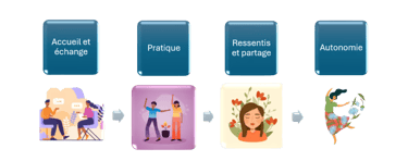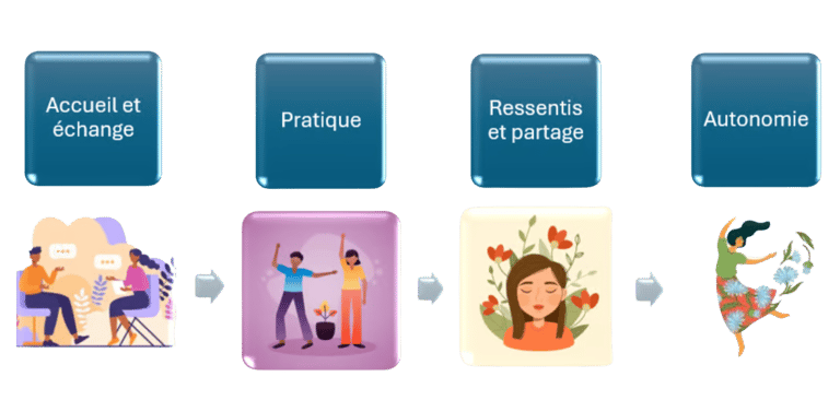 Nous commençons chaque séance par un moment d'échange où vous pouvez raconter votre semaine, parler des exercices que vous avez faits et de vos ressentis. Ce moment permet de personnaliser la séance du jour en fonction de vos besoins et états émotionnels actuels.