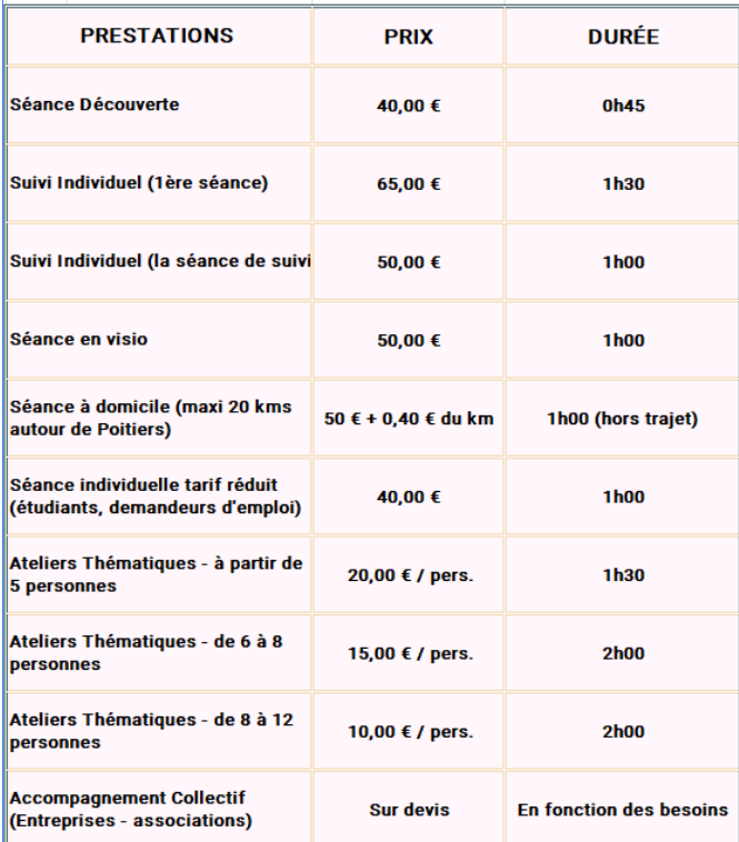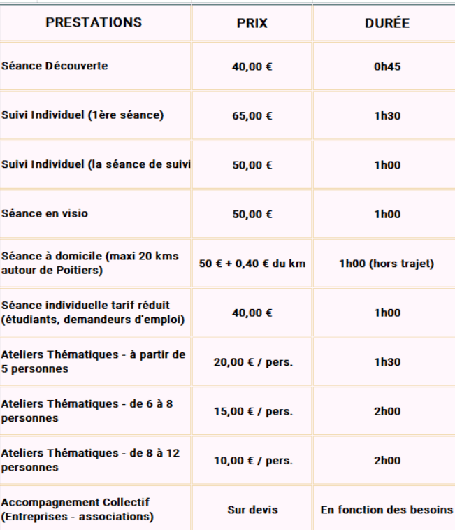 Je propose des séances individuelles ou en groupe, en présentiel ou à distance, avec des forfaits adaptés selon vos besoins.